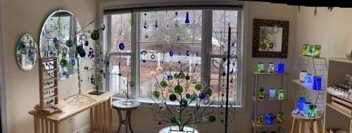 I'm enchanted by James' latest work on display in our showroom. I feel fortunate to spend time near their intricate beauty and positive energy. This is the best photo I could get on this rainy day. Come by and take a look up close!