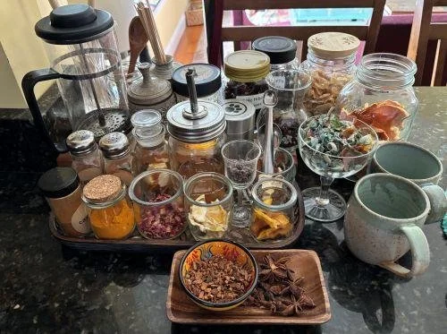 Meanwhile, I’ve been making some yummy and refreshing wellness teas using flowers and herbs and spices. It’s fun to mix and match elements to see what tastes good and is also good for you. My go-to tea for strengthening immunity is elderberry rosehip, but there are so many ways to boost the plant power in the teas as well as accentuate the flavor. I’ve put together an ever-evolving tea bar for inspiration